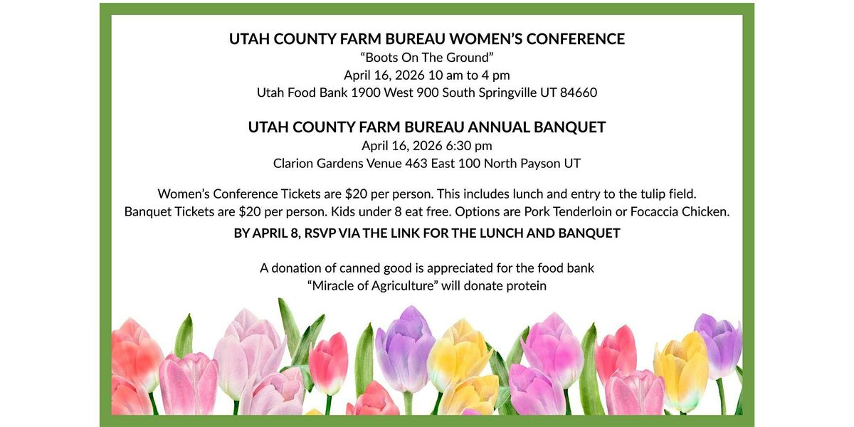 Info: While the Womens Conference may be over, the Farm Bureau fun is not. Purchase your ticket online at https://www.eventbrite.com/e/utah-county-farm-bureau-annual-banquet-tickets-1985406207412?msockid=230c40e5a0dc6a09118c55dca1416beb to attend the Utah County Farm Bureau Annual Banquet.