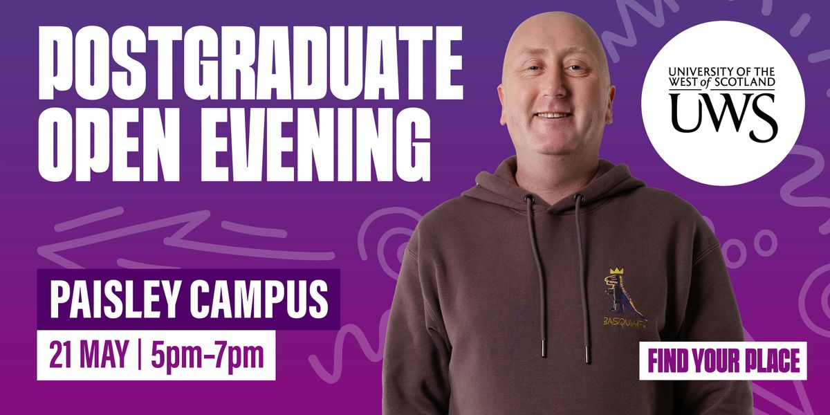 Join us on Thursday May 21st from 5:00pm to 7:00pm at our vibrant Paisley campus. This is your chance to explore our wide range of postgraduate programmes, meet our academics, tour our state-of-the-art facilities, and get all your questions answered.