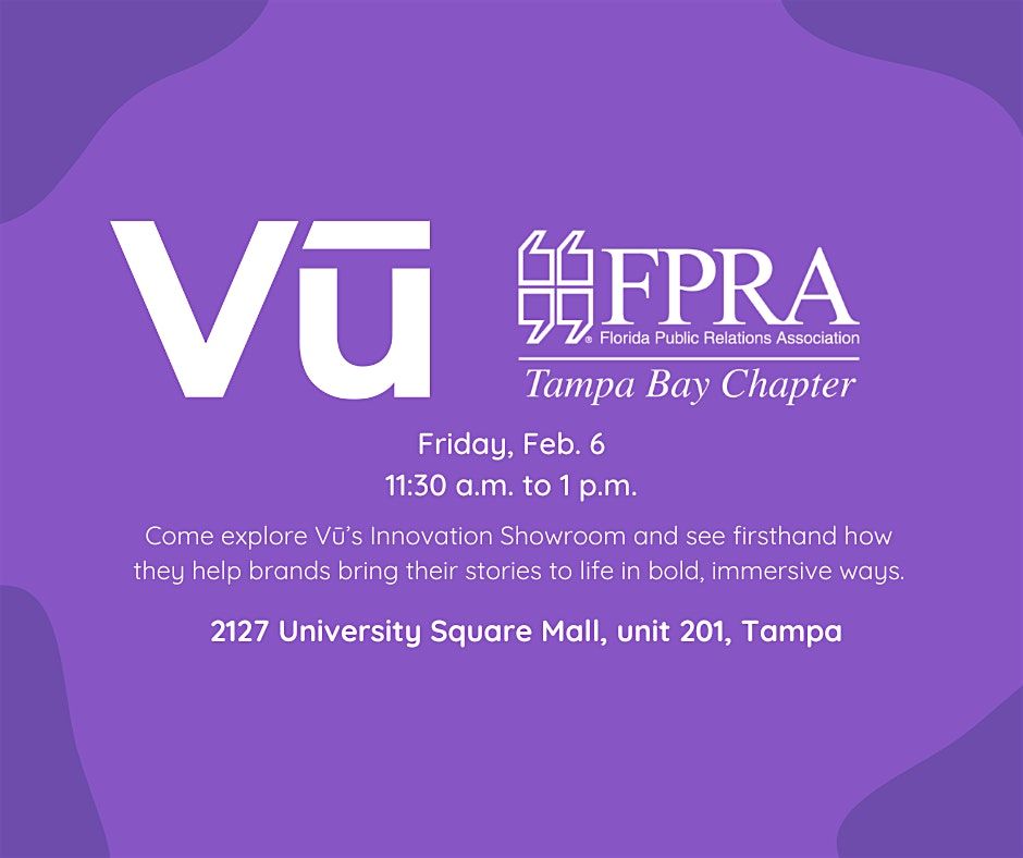 FPRA Tampa Bay is taking an exclusive tour of Vū Tampa Bay, and you won’t want to miss it! Vū is a cutting-edge creative technology company and studio network. Through their turnkey systems and software platform they empower the world to create content at the speed of thought. As public relations, communications and marketing practitioners, we use storytelling to build brands, manage reputations, engage audiences and more. Join us to learn more about content creation during this tour of Vū Studios.