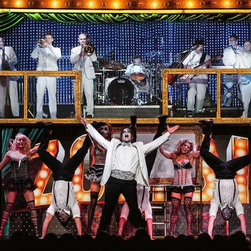 ? A lively 7-piece band playing brass instruments and guitars keeps the excitement high, as the scantily dressed zombies impressively contort themselves on stage.