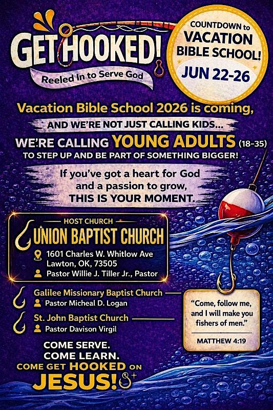 Three Lawton churches will host a VACATION BIBLE SCHOOL, June 22 - 26, 2026 from 5:30 pm to 8:00 pm. Classes will be held for all ages.About this Event