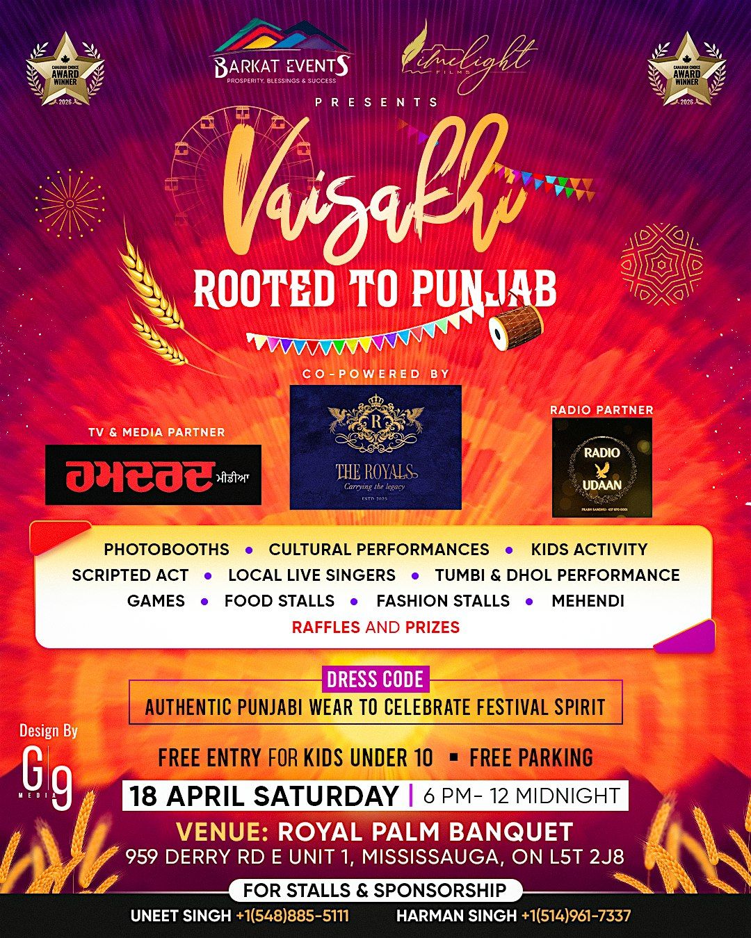Get ready to celebrate Vaisakhi like never before! Join us at the Royal Palm Banquet on April 18, 2026 at 6:00 PM (ET) for an evening full of vibrant music, dance, and culture brought to you by Barkat Events & Limelight Films. It's the perfect chance to connect with the spirit of Punjab and have a blast with friends and family. Don’t miss out on this fun, lively event!