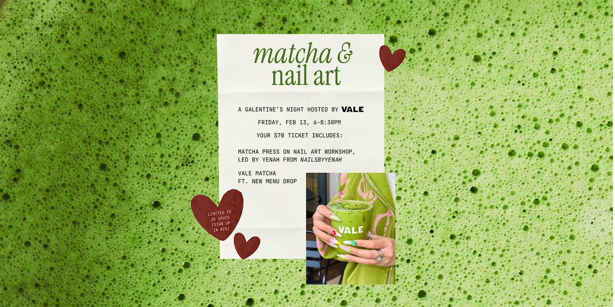 Join us for an evening of nail art, matcha, and community at Vale's Galentine Press On Nail Art Event.