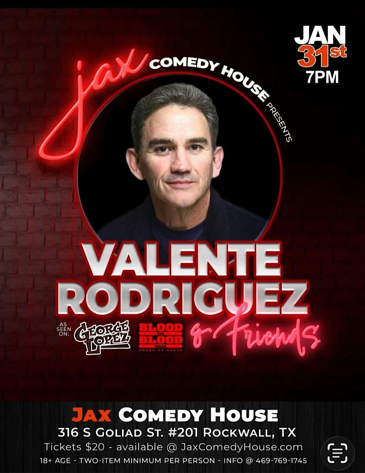 Jax Comedy House is featuring Valente Rodriguez, comedy featured on George Lopez, show and blood in blood shows.