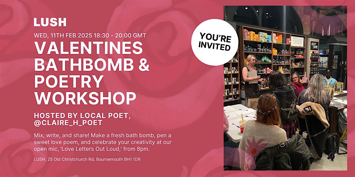 #ValentinesDayWorkshop #BathBombMaking #PoetryWorkshop #LushBournemouth #ValentinesEvent #SelfLove #CreativeWorkshop #HandmadeBathBombs #LovePoem #OpenMic #LoveLettersOutLoud