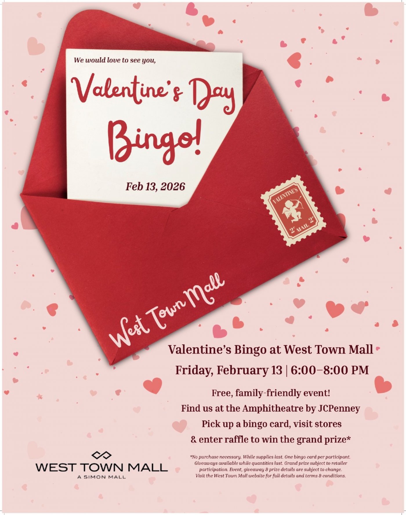 Celebrate Valentine’s weekend with a free, family-friendly experience at West Town Mall! Join us on Friday, February 13 from 6:00 to 8:00 PM for Valentine’s Bingo. Find us at the ampitheater by JCPenney, pick up a bingo card, visit participating stores to complete fun activities, and return your completed card for a chance to win prizes.