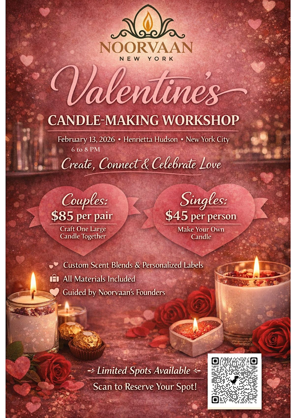Guided by the Noorvaan team, you’ll pour and design your own candle using our clean coconut–soy–beeswax blend, choosing from a curated scent library inspired by South Asian botanicals, romance, softness, and NYC energy. No experience needed, just come as you are.