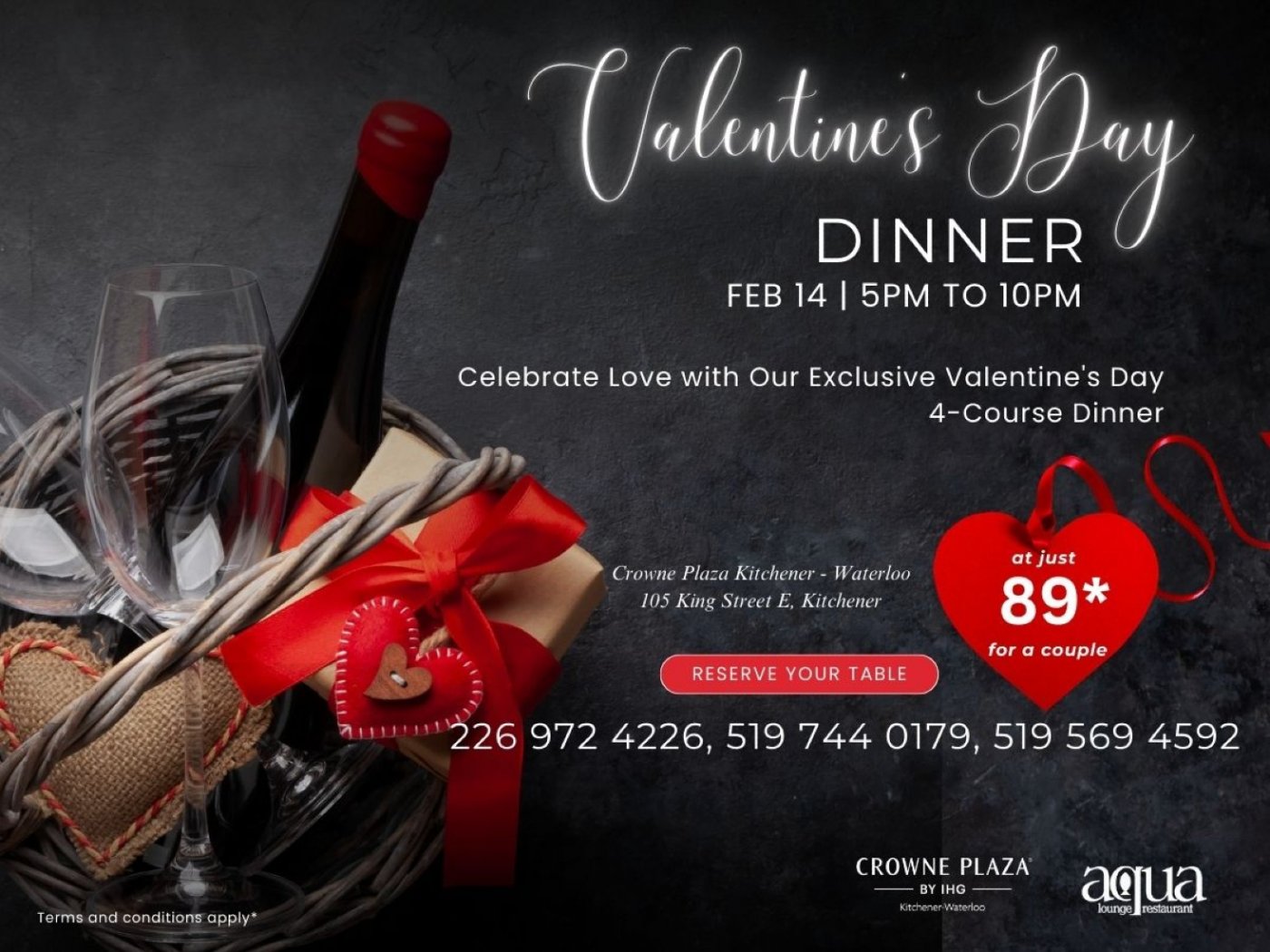 Make this Valentine’s Day unforgettable with a romantic evening at Aqua Lounge & Restaurant, located inside Crowne Plaza Kitchener-Waterloo.