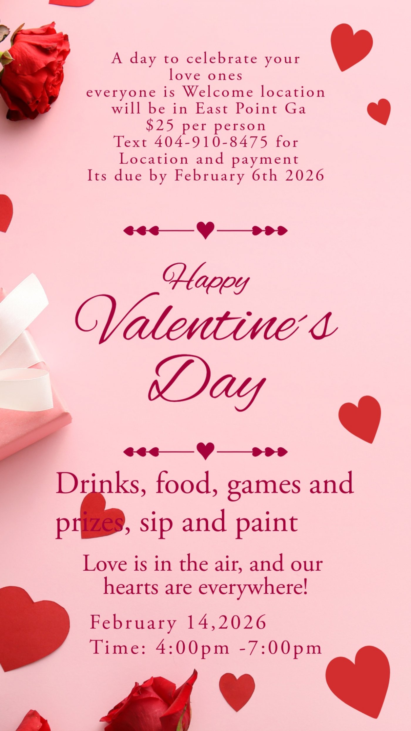 Valentine’s Day event in east point ga 2026 come enjoy a night of fun anyone is welcome food games and drinks n prizes will be available text 4049108475 for the exact location