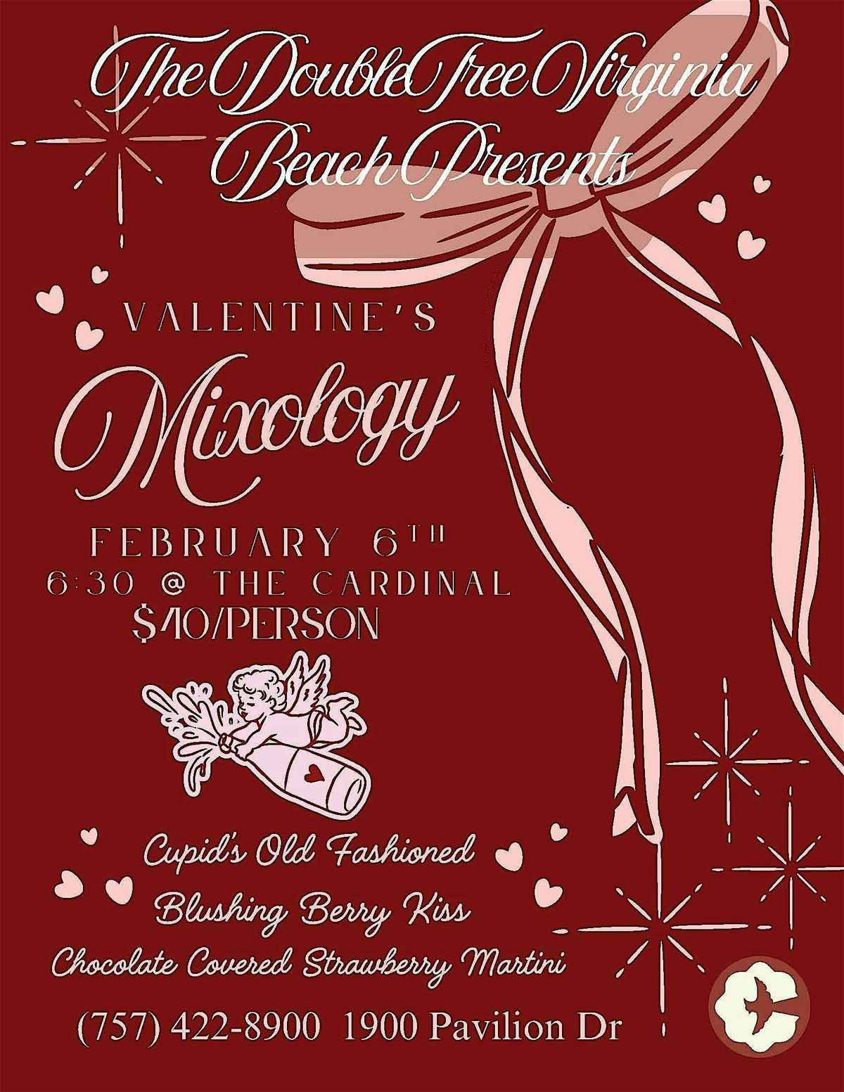 Get into the Valentine’s Day spirit with a fun and interactive Valentine’s Day–themed Mixology Class at The Cardinal Restaurant & Bar, located inside the DoubleTree Virginia Beach.