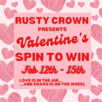 Come join us in person for some Valentine’s Day fun! Spin the wheel at the Rusty Crown and see what sweet surprises await. Whether you're single or coupled up, this is the perfect way to add a little extra excitement and maybe win some cool prizes. Don’t miss out on the laughs, love, and lucky spins!