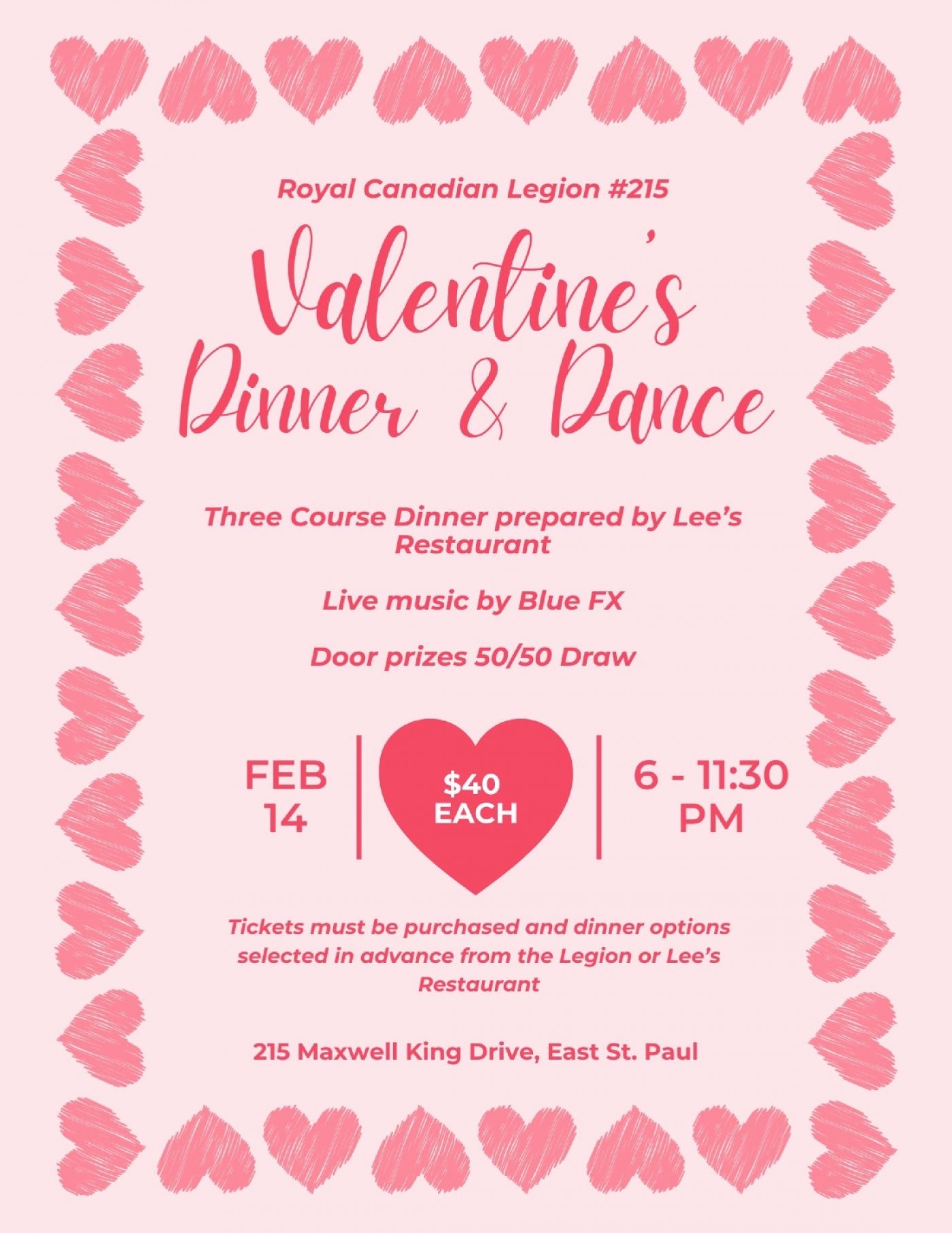 Experience an enchanting evening filled with love, laughter, and lasting memories at the Valentine’s Dinner & Dance hosted by the Royal Canadian Legion #215. Join us on February 14th, 2026, at 6:00 PM at our venue located at 215 Maxwell King Drive, East St Paul, Mb, for a delightful celebration.