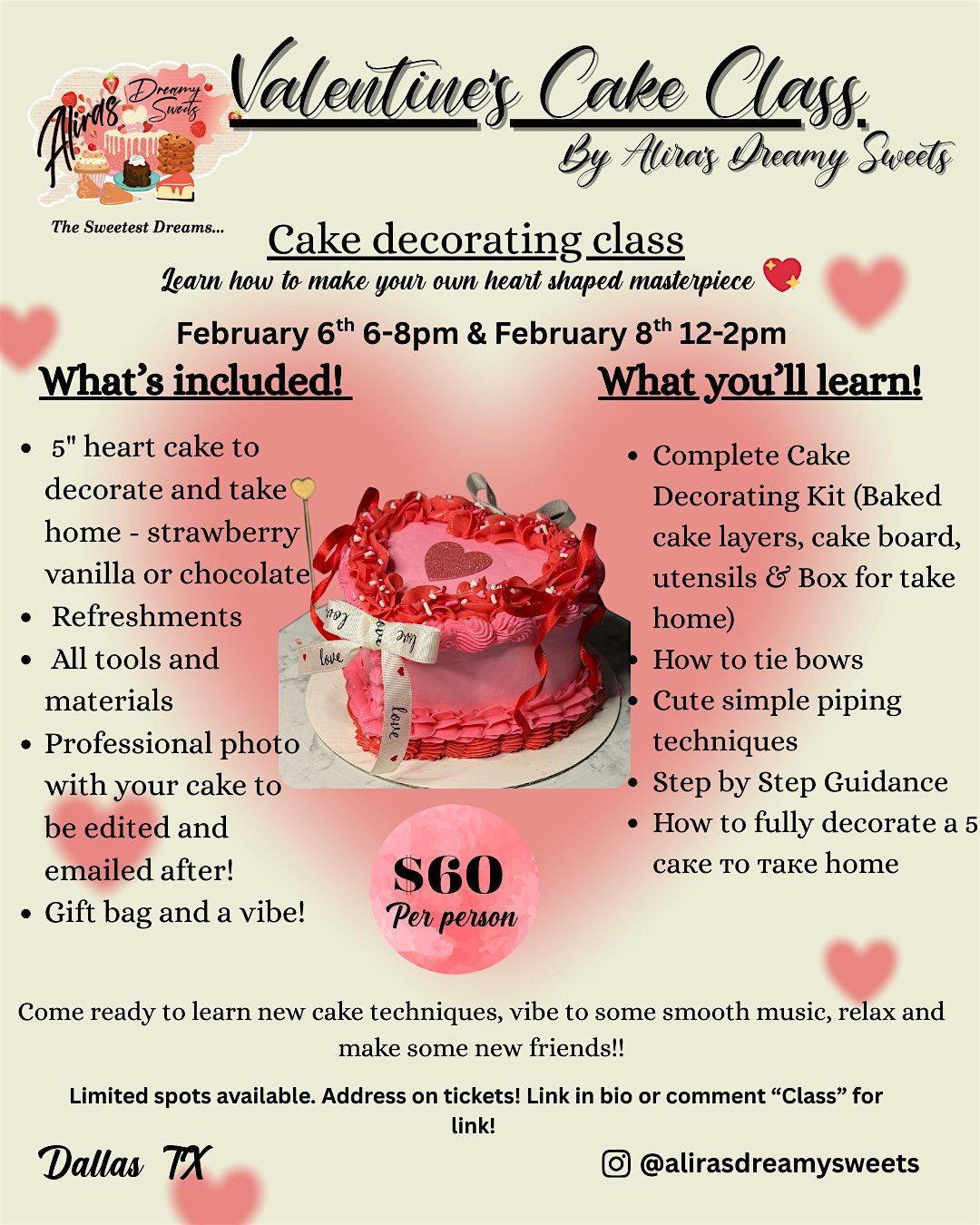 Get ready to unleash your creativity and make the sweetest treats! Join us in person for a fun-filled session where you’ll learn how to decorate heart-shaped cakes that scream Valentine’s Day vibes. Whether you’re a total beginner or a cake boss, this event is all about having a great time and leaving with a gorgeous, delicious masterpiece. Bring your love for baking and leave with a heart full of joy (and cake)!