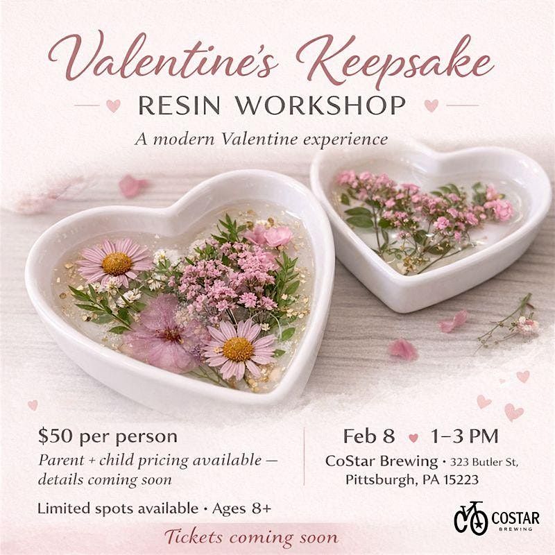 Join Chantille’s Forever Florals for a cozy, hands-on Valentine’s Keepsake Resin Workshop at CoStar Brewing. During this guided experience, guests will create a custom resin heart trinket dish or mini floral keepsake, featuring pressed flowers and elegant gold accents.