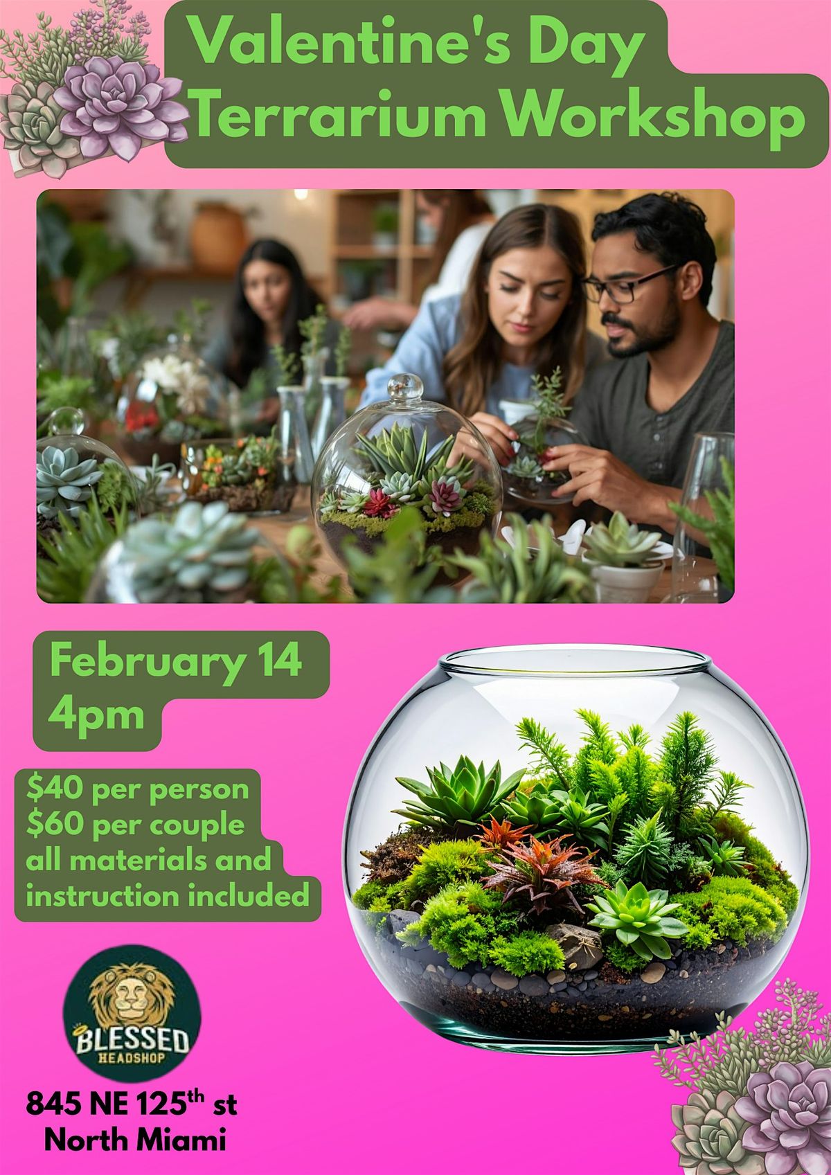 Come join us at Blessed Headshop Smoke shop and Beer on February 14, 2026 at 4:00 PM (Eastern Time) for a fun and creative workshop! Get your hands dirty and create your own unique terrarium with beautiful succulents, rocks, sand and gems.