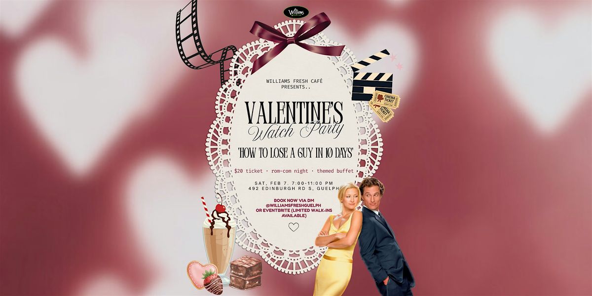 Welcome to Valentine’s Watch Party: How to Lose a Guy in 10 Days! Get ready for a night of laughter and romance at Williams Fresh Cafe. Join us on February 7, 2026 at 7:00 PM (Eastern Time) as we watch this classic movie together. Grab your food and your favorite drink, and get ready to swoon over Kate Hudson and Matthew McConaughey. Whether you're single or taken, this event is perfect for anyone looking for a fun night out. Don't miss out on the chance to celebrate love and friendship with us!