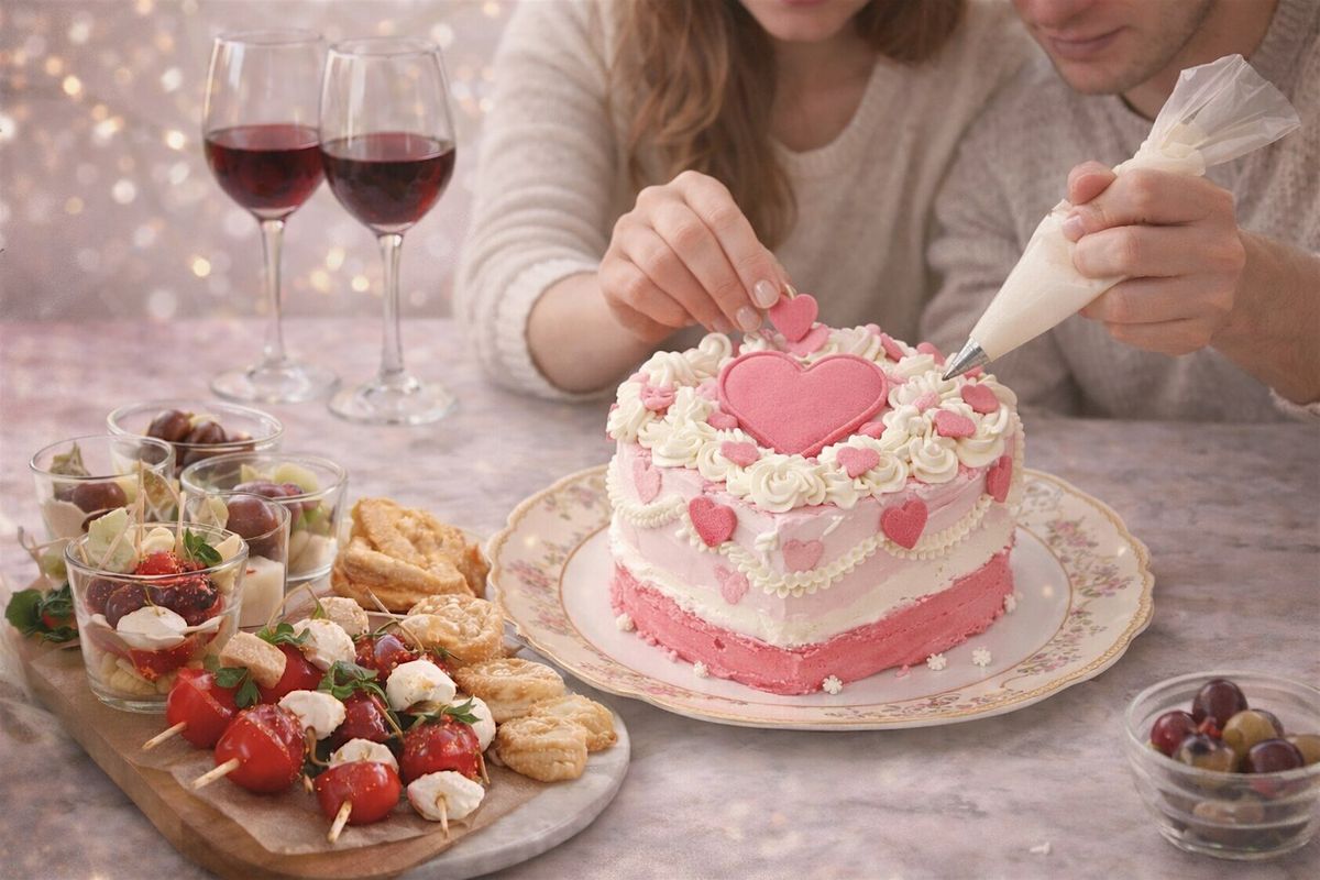 A warm, intimate experience decorating your own cake together, surrounded by Valentine décor, wine, and finger foods—perfect for couples or singles ready to try something new🤍