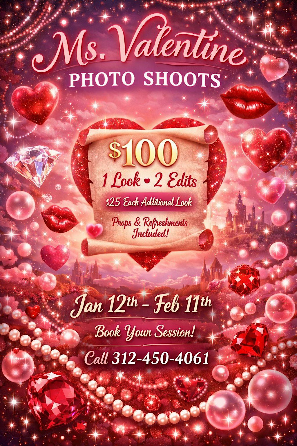 From January 12th to February 11th, weโre offering a one-of-a-kind Valentine-themed photo shoot experience that blends glamour, mystery, and whimsy. Whether you're capturing self-love, romantic vibes, or just want to sparkle in a world of pearls, rubies, and floating kisses โ this is your fantasy playground!