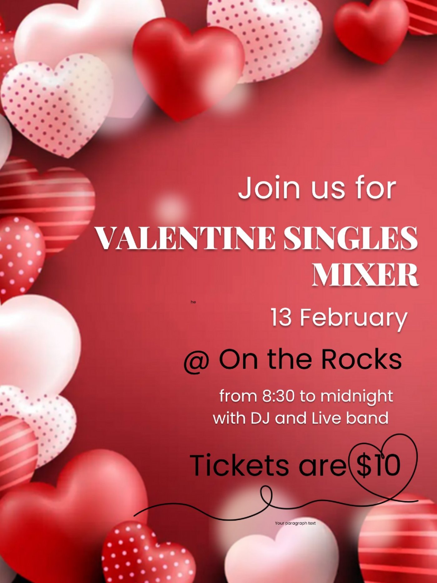 Looking for a fun way to celebrate Valentines? Look no further! Join us at On The Rocks for an exciting evening filled with music, mingling, and maybe even some sparks! Whether you're single and ready to mingle or just looking to meet new people, this event is perfect for you.