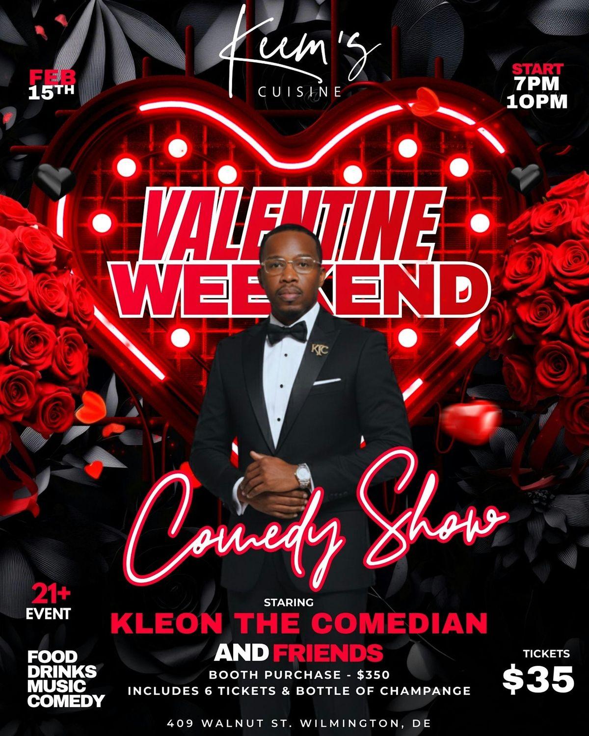 This Valentine’s Weekend, elevate your night out with laughter, love, and luxury at Keem’s Cuisine. Join us on February 15th from 7PM–10PM for an unforgettable Comedy Experience featuring the hilarious Kleon the Comedian and friends.