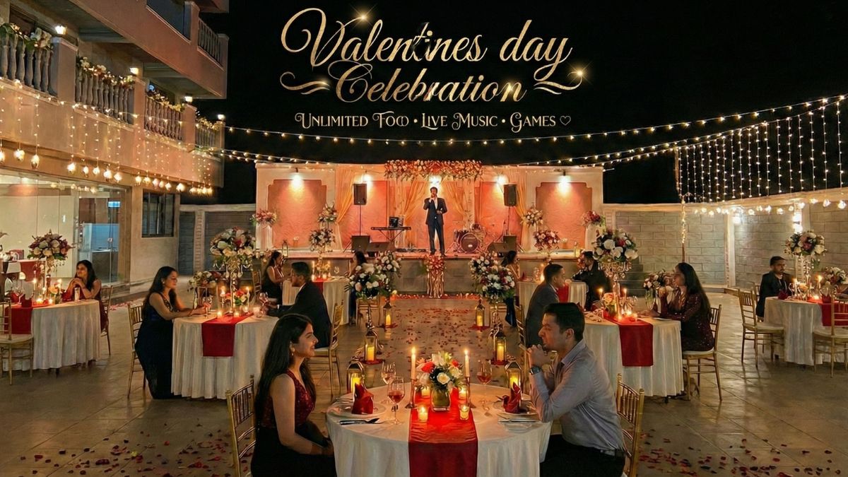 ❤️ The Ultimate Valentine’s Day Celebration in Mumbai & Thane 2026 ❤️Celebrate love this Valentine’s Day at The Saroja Grand Villa Resorts, a beautiful outdoor lawn venue designed for romantic evenings and unforgettable celebrations. This exclusive Valentine’s Day experience is curated for couples looking for one of the best Valentine’s Day celebrations in Mumbai and Thane 2026.Set under the open sky, the venue transforms into a romantic candle-lit paradise with elegant décor, ambient lighting, floral elements, and thoughtfully arranged couple seating. The spacious outdoor lawn creates a perfect balance of privacy, comfort, and festive charm.🍽️ Unlimited Gourmet Valentine’s Special MenuIndulge in a premium unlimited Valentine’s Day dinner featuring an extensive spread of vegetarian and non-vegetarian delicacies.StartersVeg: Dilruba Kebab, Paneer Ghee RoastNon-Veg: Rose Belly Chicken Tikka, Peri-Peri Fried Prawns (Ravas)SoupsVeg: Broccoli BadamisseNon-Veg: Murg Adraki SoupMain Course HighlightsMini Pizzas with Veg and Non-Veg optionsBruschetta with Veg and Chicken varietiesVeg and Chicken BiryaniRed Thai Curry with RiceMalaysian Korma with RiceChicken Chilli Garlic Pentos NoodlesChicken Akhani PulaoDessertsStrawberry ChocolateCaramel CustardAll dishes are served unlimited, making it one of the most value-packed Valentine’s Day dinner experiences in Mumbai and Thane.🎶 Live Music | 🎲 Couple Games | 🎁 Romantic SurprisesThe evening features a dedicated stage with professional lighting and live music performances that enhance the romantic atmosphere. Couples can enjoy interactive games, fun activities, and special gifts curated to make the celebration memorable and engaging.🌹 Venue HighlightsOutdoor lawn setup at The Saroja Grand Villa ResortsDedicated stage with ambient and decorative lightingElegant Valentine-themed décorComfortable couple seating arrangementsCouple games and surprise giftsParking facility availableBar service for a complete evening experience💖 Why This Is a Top Valentine’s Day Event Romantic outdoor lawn venueUnlimited gourmet foodLive entertainment and couple activitiesPerfect for Valentine’s Day date nightsHighly recommended Valentine’s Day celebration in Mumbai and ThaneCelebrate love, laughter, and togetherness this Valentine’s Day.