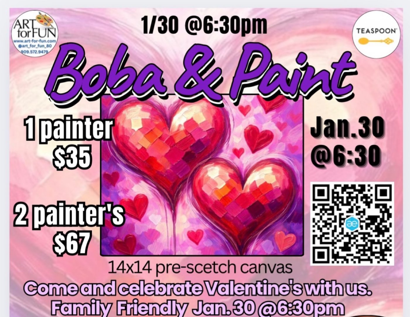 Grab a brush, finger foods & a boba drink, and let the good vibes flow! Join us for a lively evening of art, drinks, and creativity. Whether you’re a professional artist or picking up a paintbrush for the first time, this 2-hour guided paint party is the perfect way to relax, laugh, and create with friends and family.