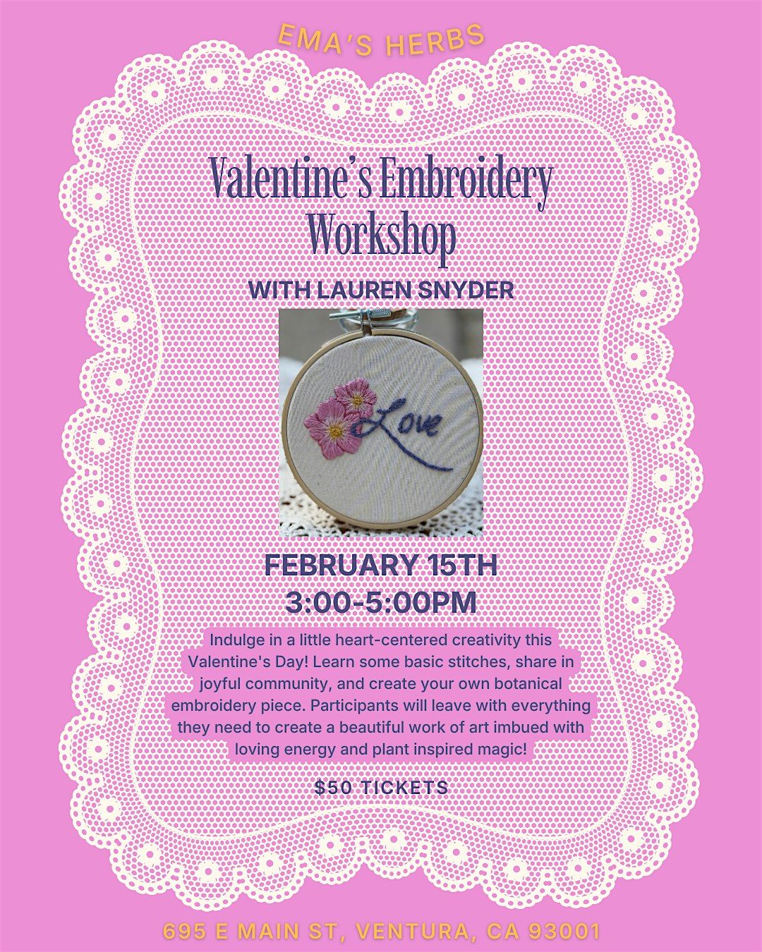 Indulge in a little heart-centered creativity this Valentine's Day with another Botanical Embroidery workshop! Join local herbalist and botanical artisan, Lauren Snyder, as you learn some basic stitches, share in joyful community, and create your own botanical embroidery piece. All materials will be provided and participants will leave with everything they need to create a beautiful work of art imbued with loving energy and plant inspired magic. All levels of experience are welcome!