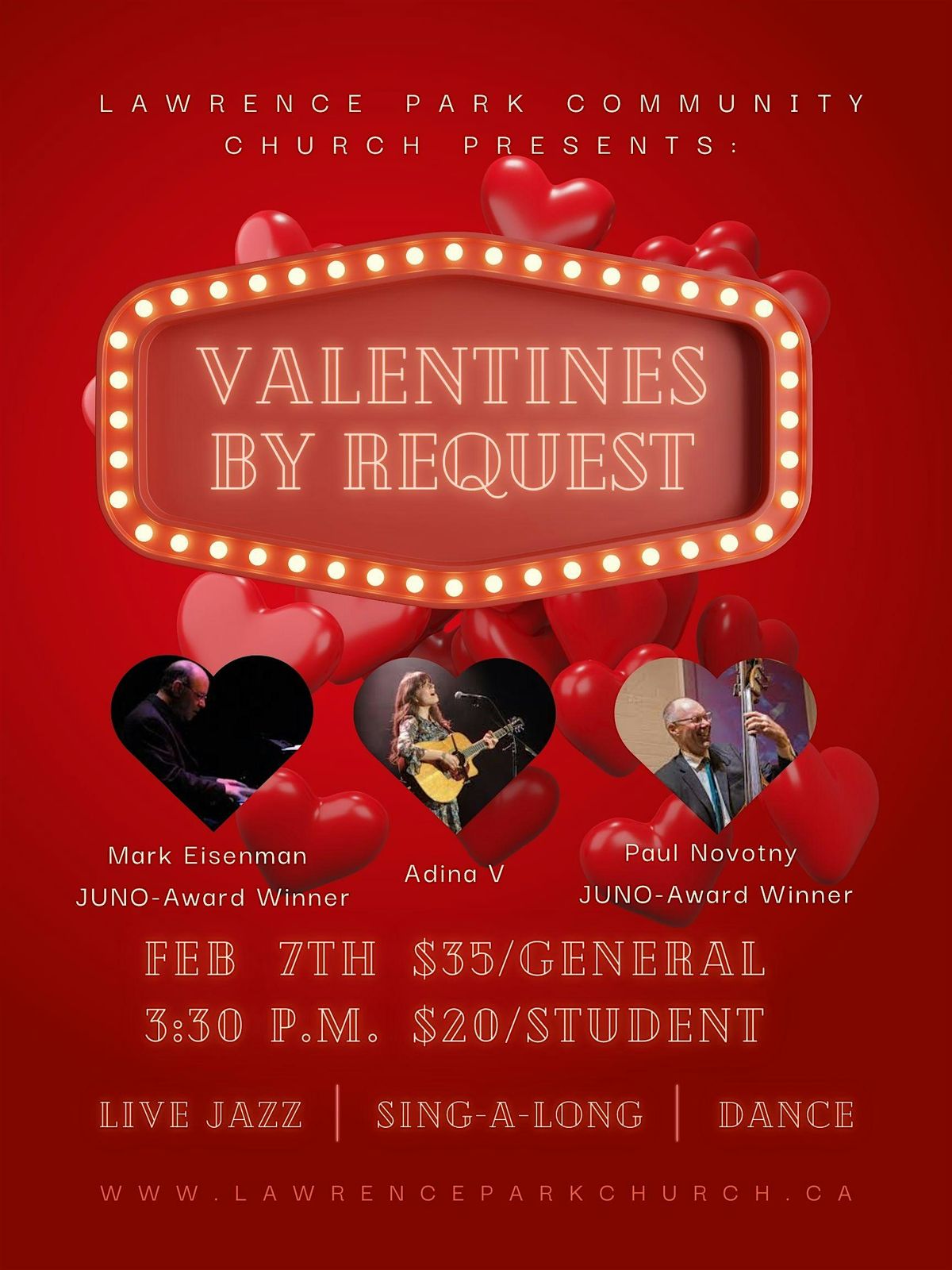 Experience a swoon-worthy afternoon of jazz music at Valentine’s by Request, at the Lawrence Park Community Church Sanctuary on Saturday, February 7, at 3:30 PM! This isn’t just a concert; it’s a personalized jazz experience featuring the soulful vocals of Adina Vlasov backed by a powerhouse trio of all-stars: Mark Eisenman on piano, Paul Novotny on acoustic bass, and Daniel Rubinoff on saxophone. We’re putting the setlist in your hands—starting this Sunday, January 12, Music Director, Daniel Rubinoff, will be fielding requests of your favourite songs to see them brought to life by these masters. With a lively audience sing-along component added to the mix, it’s the perfect way to celebrate the season of love through music.
