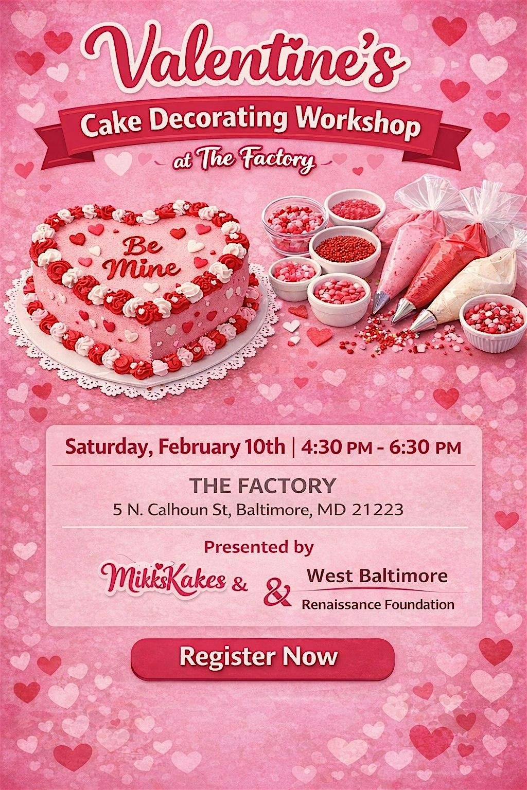 Join us for a festive Valentine’s Cake Decorating Workshop at The Factory on February 10th at 4:30pm.