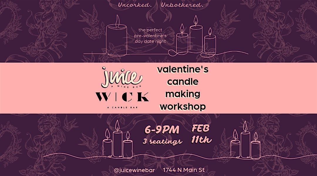 Welcome to a VALENTINE'S CANDLE WORKSHOP BY Wick x Juice Wine Bar! Join us for a cozy evening at Juice Wine Bar where we'll be sipping on delicious wines and creating our very own hand-poured candles, right on the bar! This event is the perfect way to unwind and get creative with friends or loved ones. Whether you're a candle-making pro or a complete beginner, everyone is welcome to join in on the fun. Don't miss out on this unique experience - reserve your spot now!