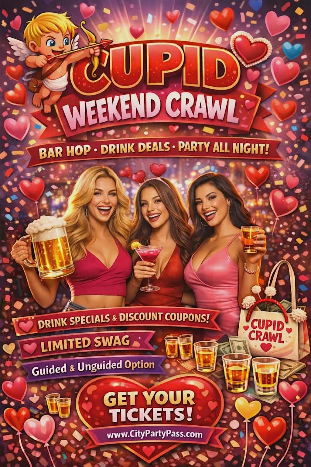 Get ready to party all across Philadelphia and celebrate Cupid Weekend with the ultimate bar crawl experience. Grab your ticket and enjoy access to multiple participating bars, exclusive drink specials, and nonstop nightlife energy all weekend long.