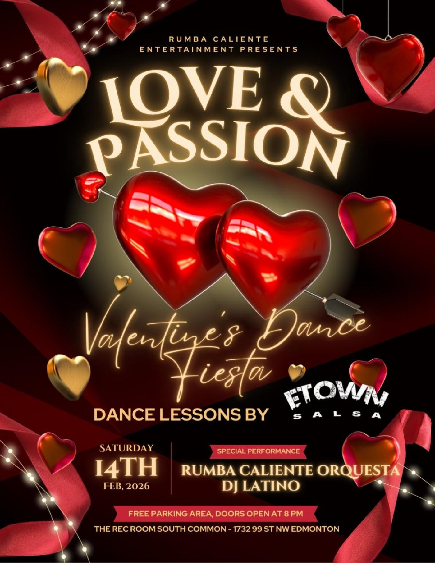 Celebrate love in the most vibrant and rhythmic way at the Valentine's Dance Fiesta presented by Rumba Caliente: Edmonton Latin Orchestra. Get ready to move and groove all night long at this electrifying event featuring live music by the talented Rumba Caliente Orquesta, exciting dance lessons by E-town salsa, and beats that will keep you on your feet by the sensational Dj Latino.