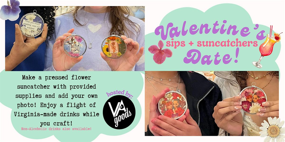Join us for a fun afternoon of crafting and tasting on Sat Feb 14, 2026 at 1:00 PM at VA Goods inside Selden Market. Get creative and make your own Pressed Flower Suncatcher while trying a flight of delicious Virginia-made drinks. Cider, Sangria, Cocktails, Beer and non-alcoholic options available. It's the perfect way to spend quality time with significant other or friends.