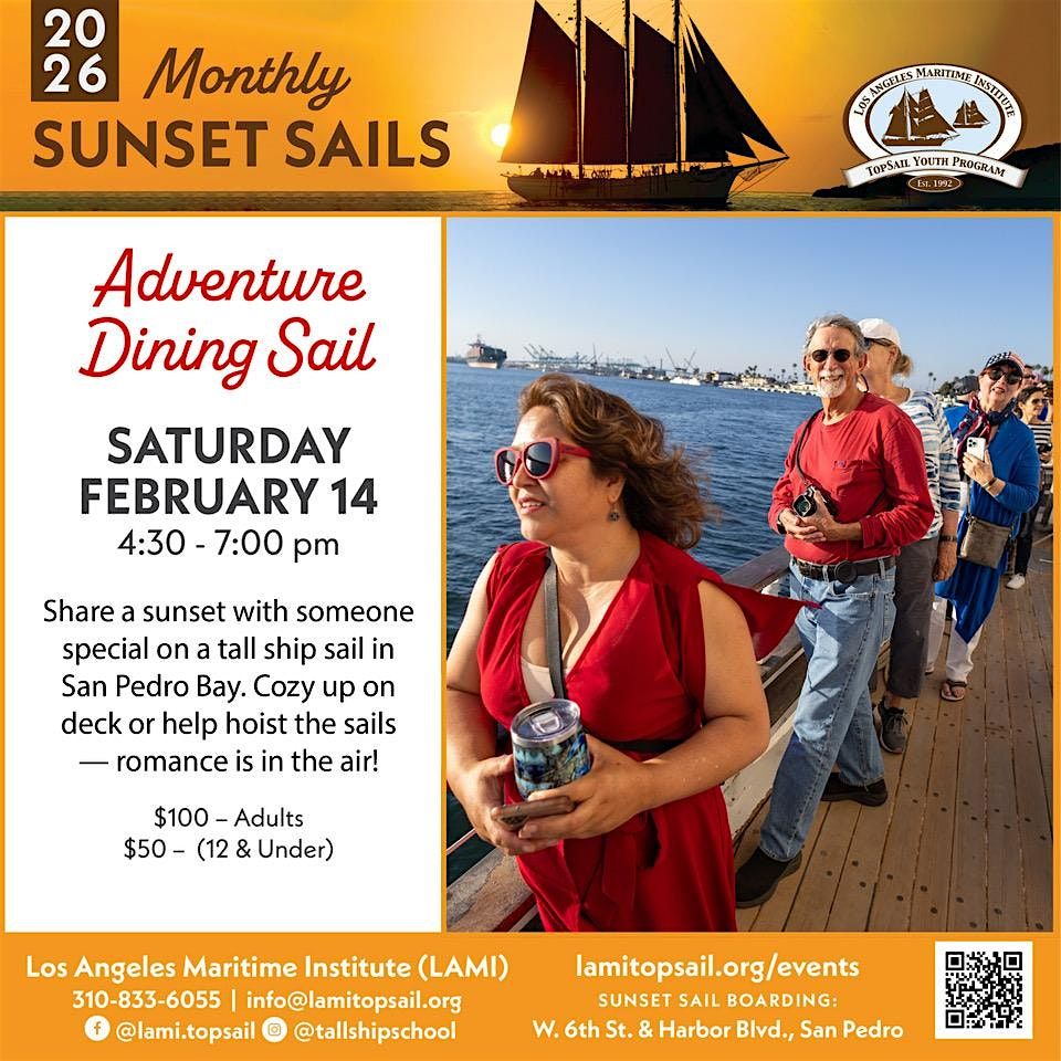 Sail the San Pedro harbor with your special someone as you enjoy the sunset together! Join us for this special Valentine's Day sail with a delicious dinner prepared by our Galley Chef, as well as dessert and non-alcoholic beverages. (Wine is not included in our menu, but you are welcome to bring your own.)