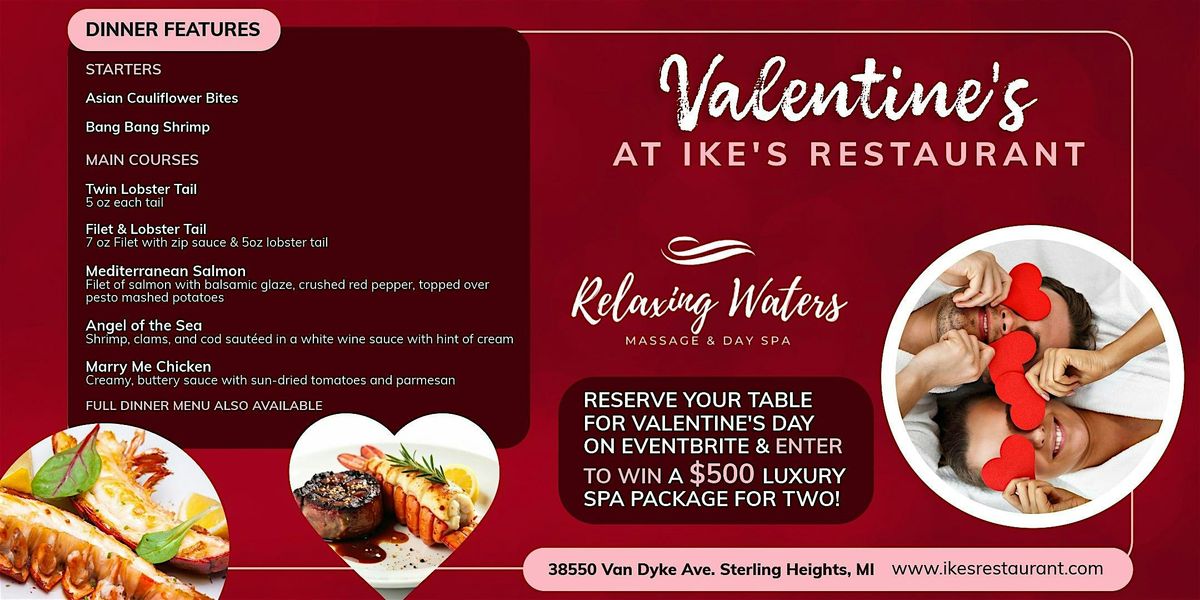 Reserve your table for Valentine's Day at Ike's Restaurant on Eventbrite and Enter to Win a $500 Luxury Spa Package for Two.