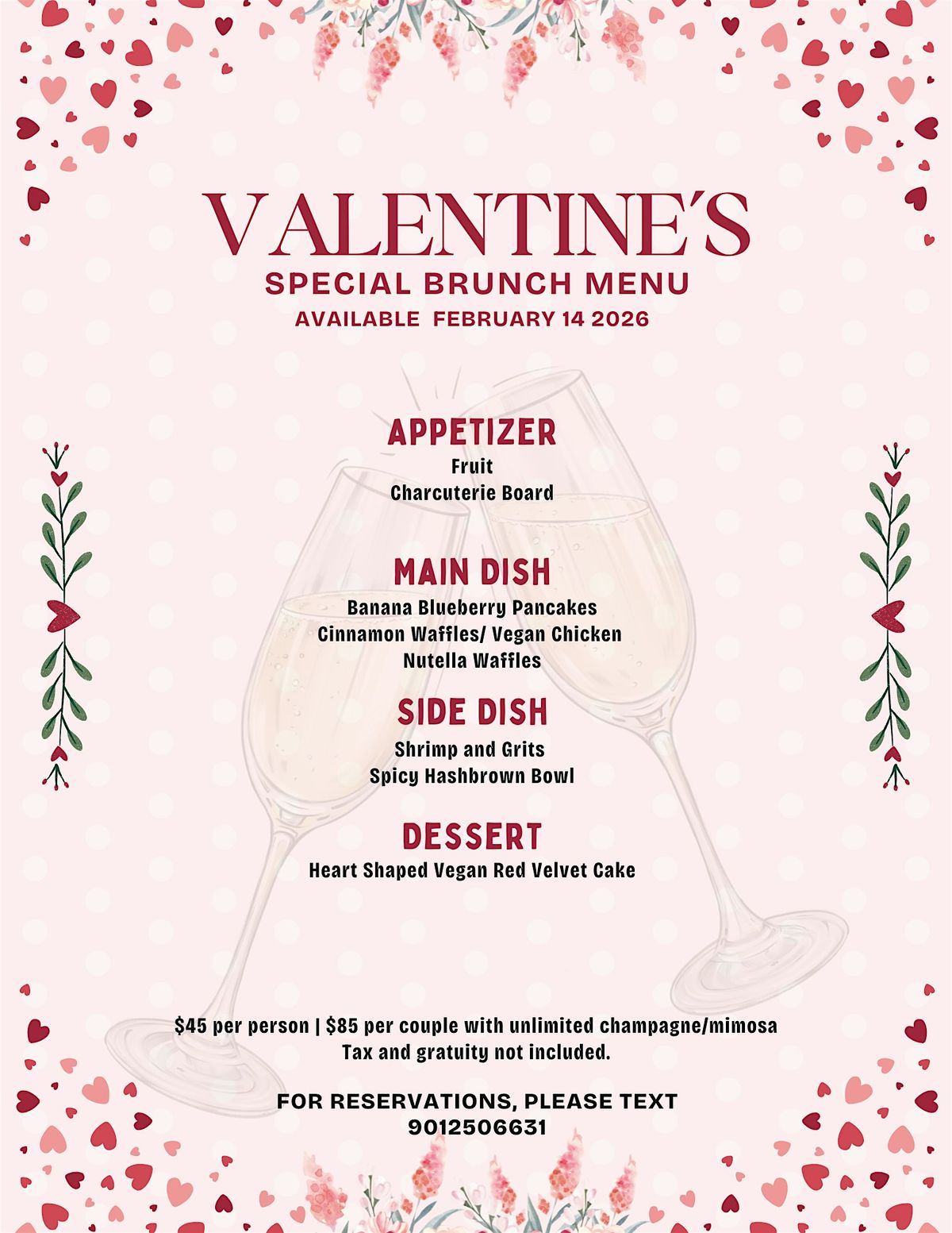 Welcome to Valentines Day Brunch at Vegan Haven! Join us on February 14, 2026 at 11:00 AM for a delightful brunch experience. Let's celebrate love and friendship in a cozy atmosphere surrounded by delicious vegan dishes. Come enjoy a special menu crafted with love just for you. Don't miss this opportunity to share a meal with your loved ones, or solo and create lasting memories. We can't wait to see you there!