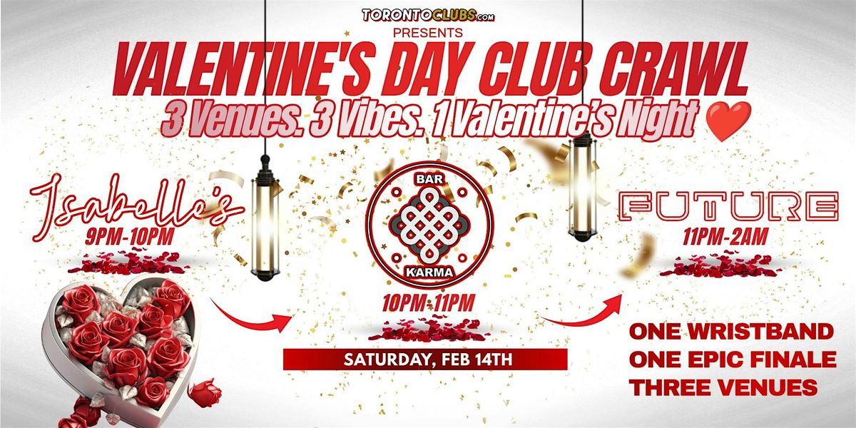 3 Venues. 3 Vibes. 1 Valentine's Night ❤️ in Downtown Toronto alongside a VIP HOST that will escort the entire crawl venue to venue until the FINALE (Final Venue). Please EMAIL [email protected] for more information or Bottle Service .
