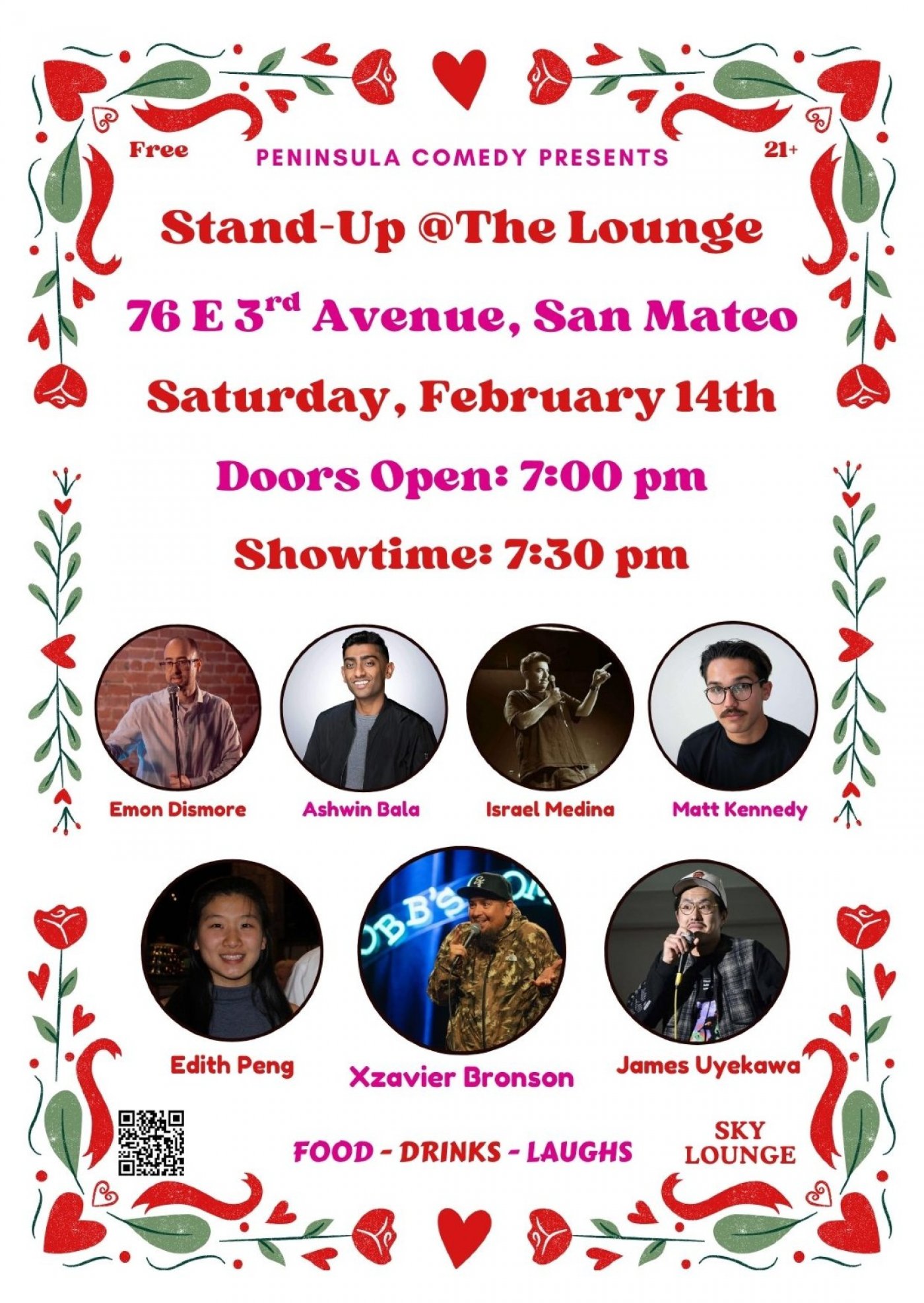 Welcome to the BEST & ONLY Stand-Up Comedy Show in Downtown San Mateo, Stand-Up @The Lounge at Sky Lounge. The artform of Stand-Up Comedy has found a new home in this elegant and beautiful space. This venue has a full-service bar and if you're in the mood for a bite, is conveniently located nextdoor to an Indian restaurant. Enjoy some hand-crafted cocktails, fresh samosas, and top local talent.