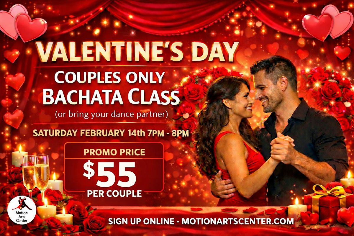Join us for our Valentine’s Day Couples-Only Bachata Dance Class at the beautiful Motion Arts Center on Saturday, February 14, 2026 from 7:00–8:00 PM.