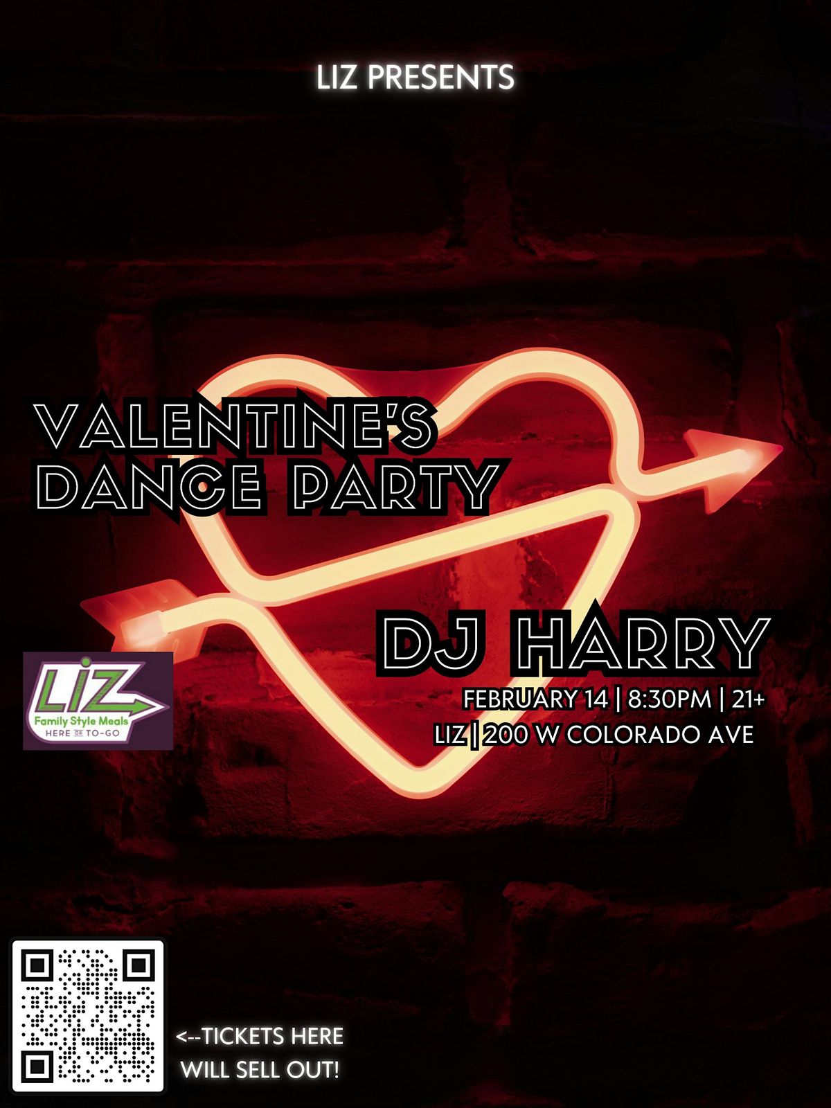 Attention, Lovers! Get ready to dance the night away this Valentine's Day at LIZ. Everyone had so much fun at our New Year's Eve dance party, we're doing it again, Valentine's Day style! Do you miss the legendary nights at the Chocolate Lover's Fling? Come get your groove on, just like the good old days! Bring your lover or come solo and find love on the dance floor...just be sure to show up ready to boogie! A party at LIZ is all about good times and great company. DJ Harry spins all night!
