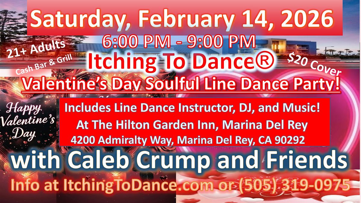 Join Itching To Dance® with Caleb Crump and Friends, at the Hilton Garden Inn, in Marina Del Rey for a fabulous Valentine's Day Dance Party. There will be Open Floor Dancing, Line Dancing, Music DJ'ing, and Fun as we dance the night away.