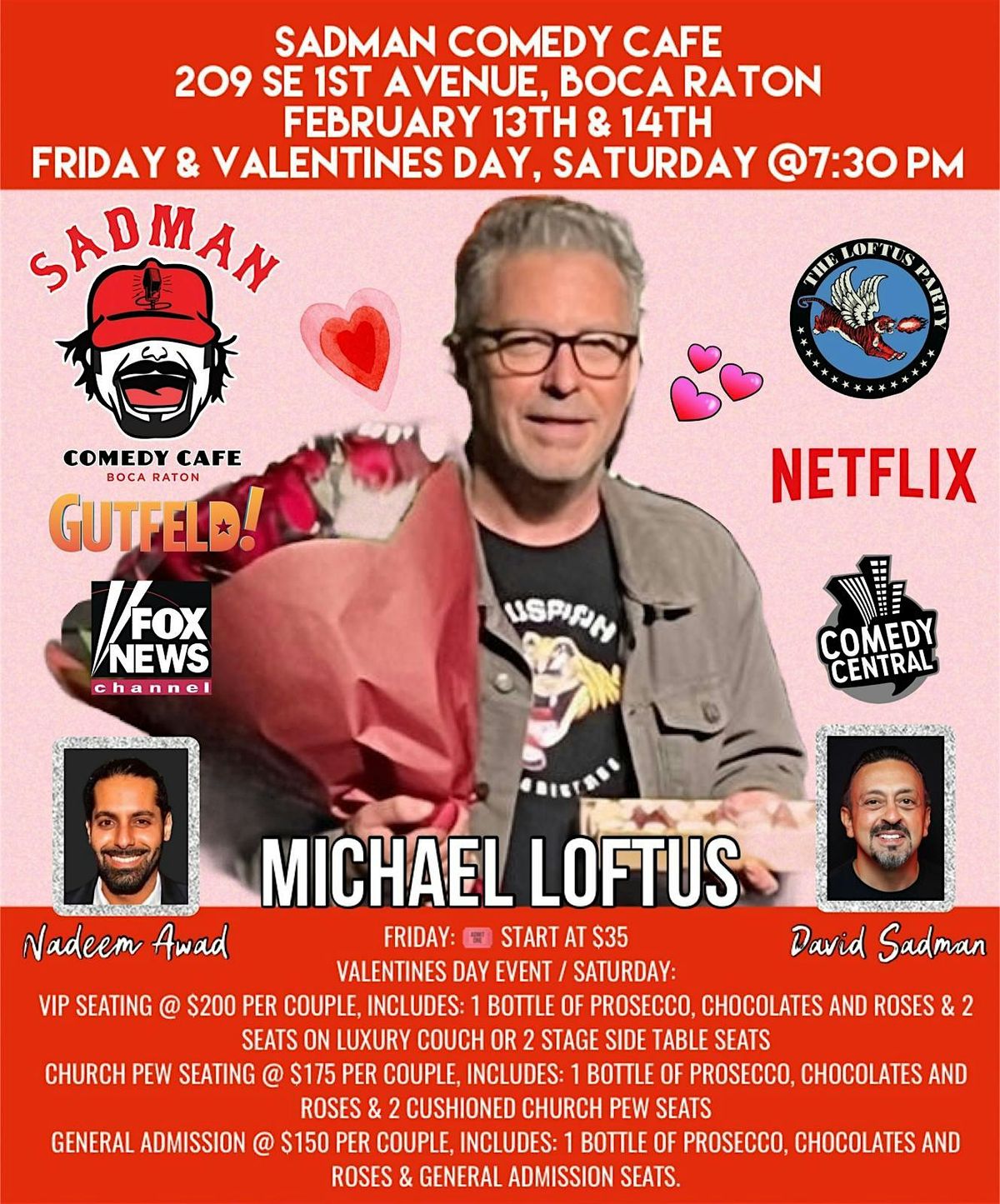 Skip the awkward dinner and do something you’ll both laugh about. Join us for a special Valentine’s (Eve) comedy experience Starring Michael Loftus, known for his sharp wit and appearances on Netflix, Comedy Central, Fox News, and Gutfeld! With his bold, intelligent humor and fearless takes, Michael delivers a night of comedy that’s perfect for couples who love to laugh together.