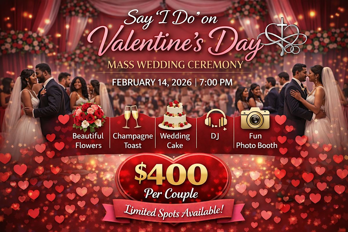 Celebrate love in the most unforgettable way! Join us for an in-person group wedding where couples come together to say “I do” surrounded by joy and friendship. Whether you're tying the knot or just want to soak up the romantic vibes, this event will make your Valentine's Day extra special. Expect laughter, heartfelt moments, and a whole lot of love. Don’t miss out on this unique celebration!
