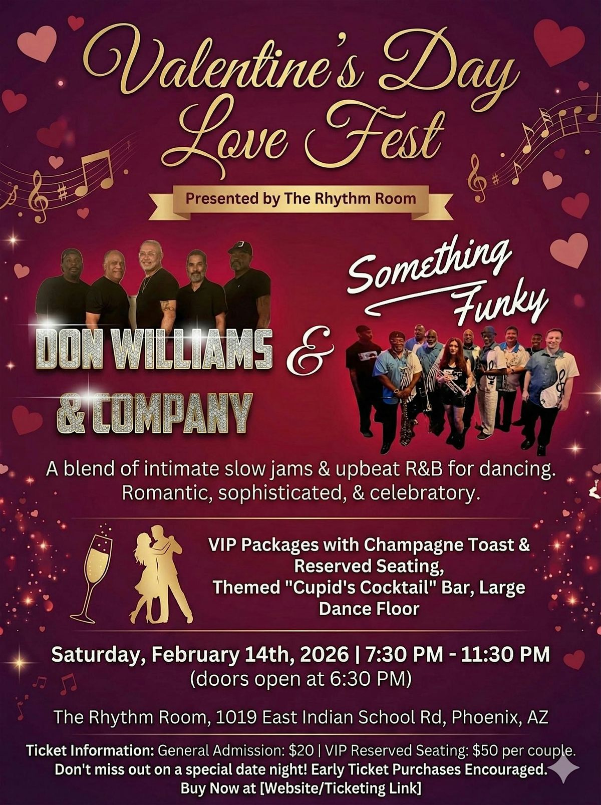 Join us for a fun-filled and romantic celebration! Whether you're single or coupled up, this in-person event is all about spreading love and good vibes. Expect plenty of good music featuring Recording Artist Something Funky, and world renowed Recording Artist Don Williams formerly of the Commodores & Company. Don’t miss out on this unforgettable day dedicated to heartfelt joy and celebrating love in every form!