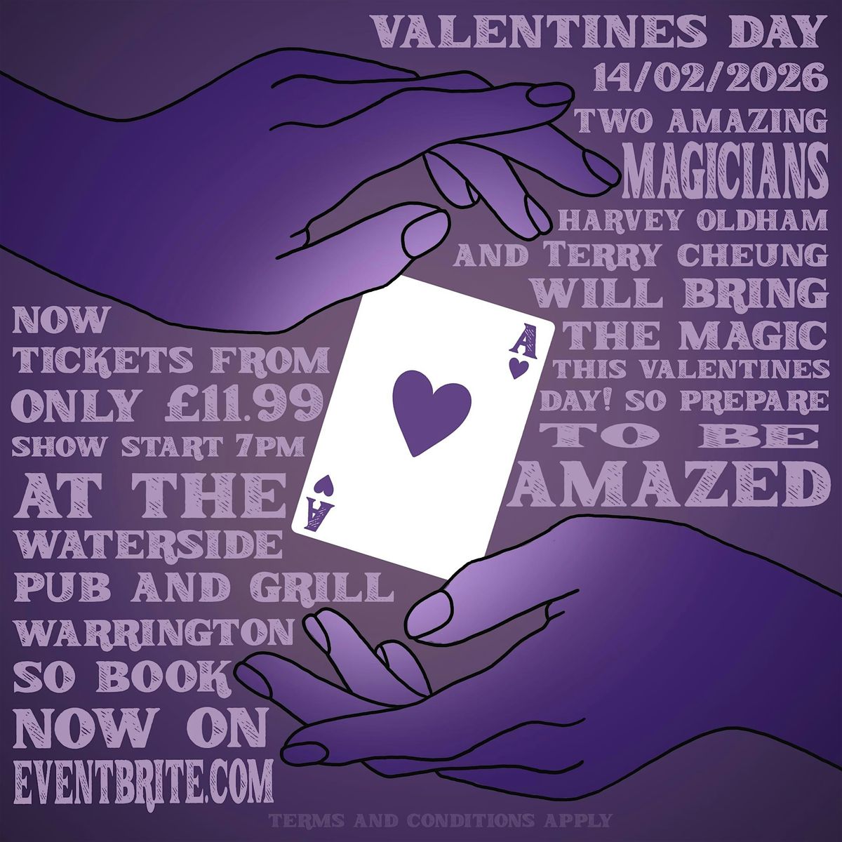 Wanna add some magic to your valentines day this year? come on down the The Waterside Warrington for an amazing night of illussion, magic and mind bending fun! whether you're looking for a date idea, rocking a galentines day or flying solo, dont miss out on this amazing performance by our two amazing magicians! The show will be held at The Waterside Warrington so if you're hungry for more than magic, book a table and make a night of it!