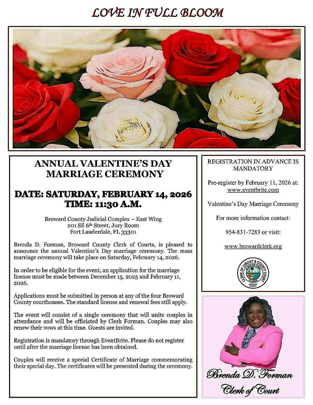 A valid Florida marriage license is required. Florida residents must have their license by February 11, 2026 unless they provide proof of completion of a premarital course. Please visit www.browardclerk.org for more information about obtaining the marriage license.