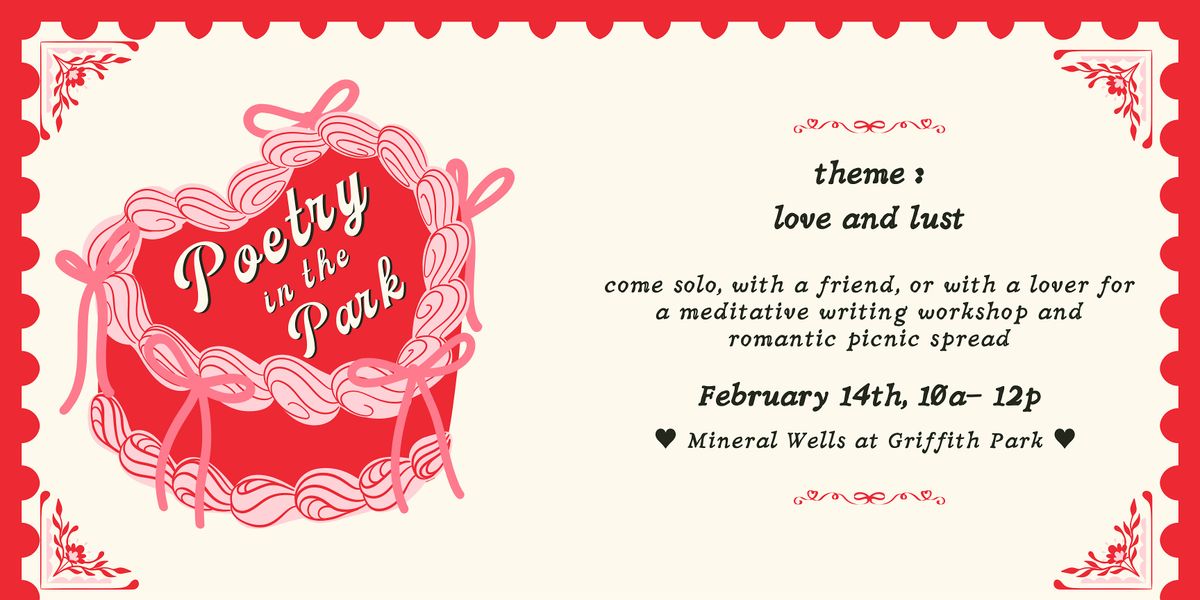 This is a writing workshop for poets of all levels! Poetry in the Park is an intimate experience where you will be asked to look inward to create your own unique and beautiful poems. Creative guidance and prompts will be provided. All poets will be encouraged to share their writing aloud! This gathering will have complimentary snacks and drinks.