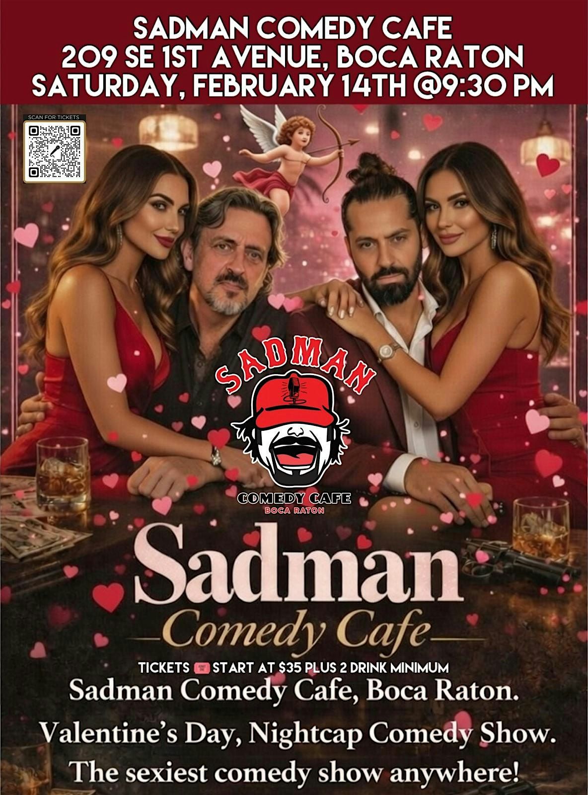Celebrate Valentine’s Day with the sexiest comedy show in Boca Raton at Sadman Comedy Cafe. This late-night Valentine’s Day comedy event features bold, unfiltered stand-up comedy, craft cocktails, and an intimate nightclub atmosphere—perfect for couples, date nights, and anyone looking for something fun to do on Valentine’s Day in South Florida.