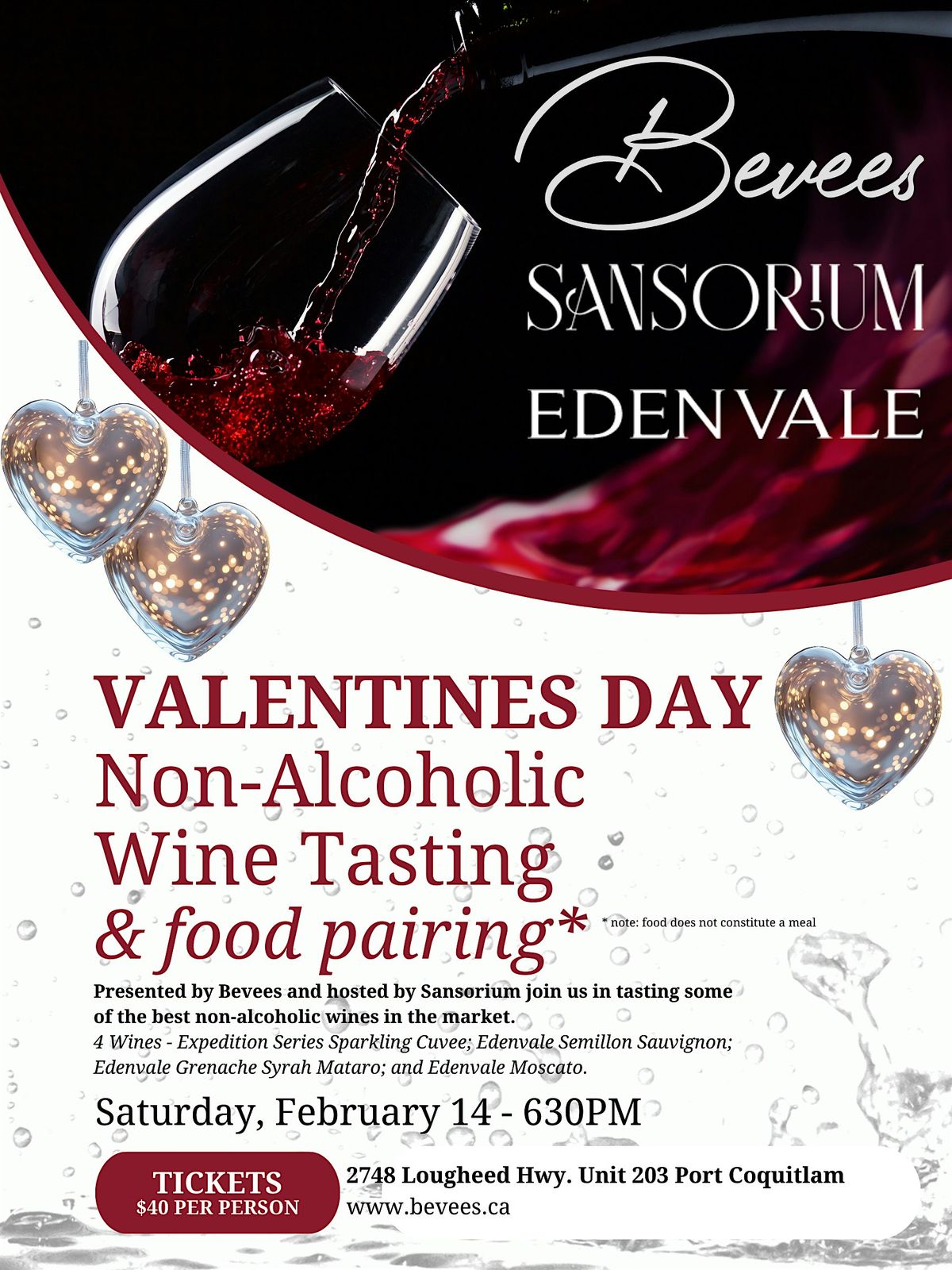 Welcome to Valentines Day Non-Alcoholic Wine Tasting & Food Pairing at Bevees Booze-Free Bottle Shop & Beverage Room! Join us on February 14, 2026 at 6:30 PM for a delightful evening of exquisite flavors and great company. Indulge in a selection of Australian non-alcoholic wines from Edenvale expertly paired with delicious bites. This event is perfect for wine enthusiasts looking for a unique experience. Come celebrate love and friendship in a cozy setting. We can't wait to see you there! (Pacific Time)