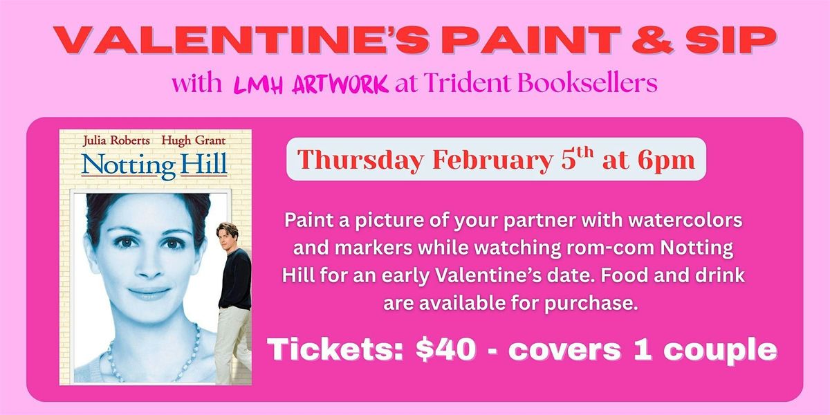 Enjoy an early Valentine's Day date with your partner painting each other while watching Notting Hill at Trident Booksellers. Each ticket provides 2 pieces of watercolor paper and other materials. One ticket covers one couple.